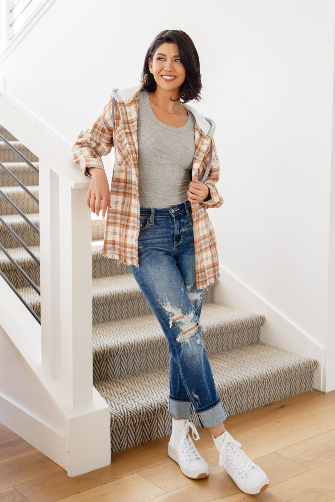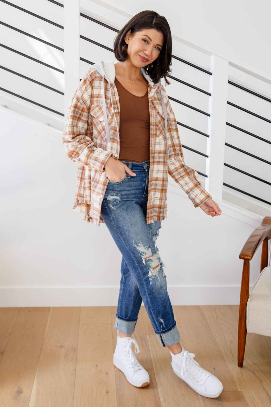 Introducing Best of the Best Hooded Shacket, the perfect addition to any wardrobe! This brushed mid-weight flannel provides warmth and effortless style. Features include a hood, snap closure, pockets, raw hem, and mute plaid for a fashionable look that will never go out of style. Experience the ultimate comfort of this must-have layering piece!